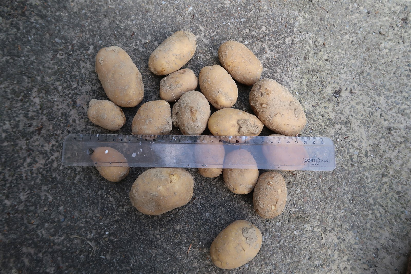 Erste Saatkartoffeln wurden geerntet, die Arbeit steht auch für übrige Ware bald an. Die Felder trocknen nun endlich ein wenig ab, dabei bildet sich aber eine harte Kruste auf den Kartoffeldämmen, welche die Ernte erschwert. Die Probegrabungen zeigen vielerorts,wie erwartet, kein schönes Bild. Die Kaliber sind mancherorts bei weitem nicht erreicht (siehe Bild).