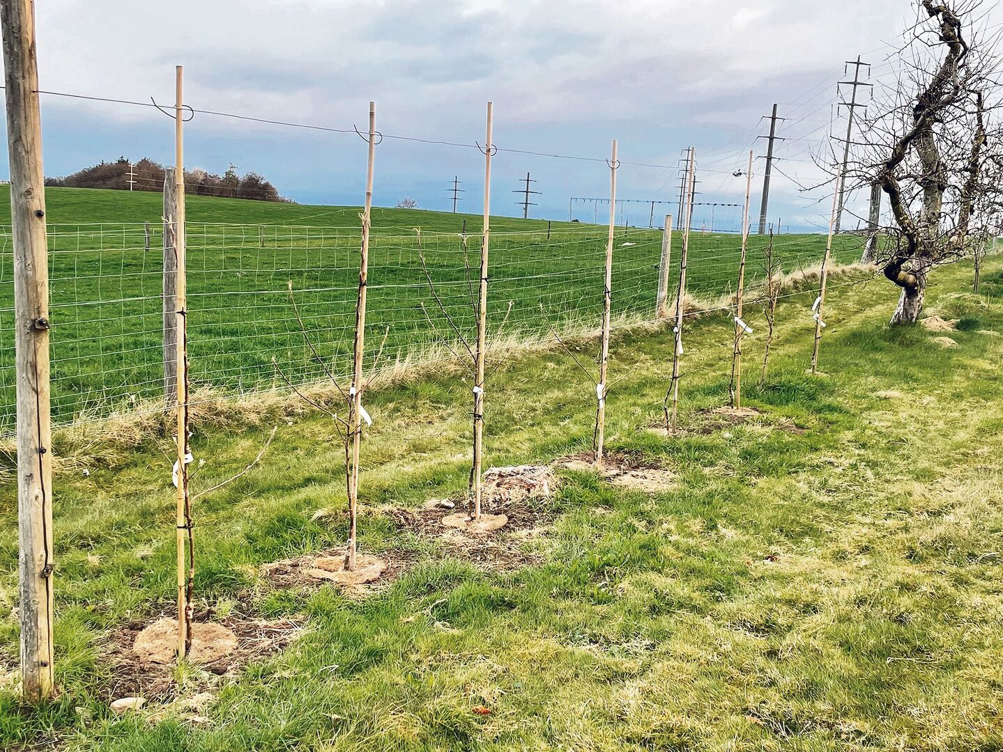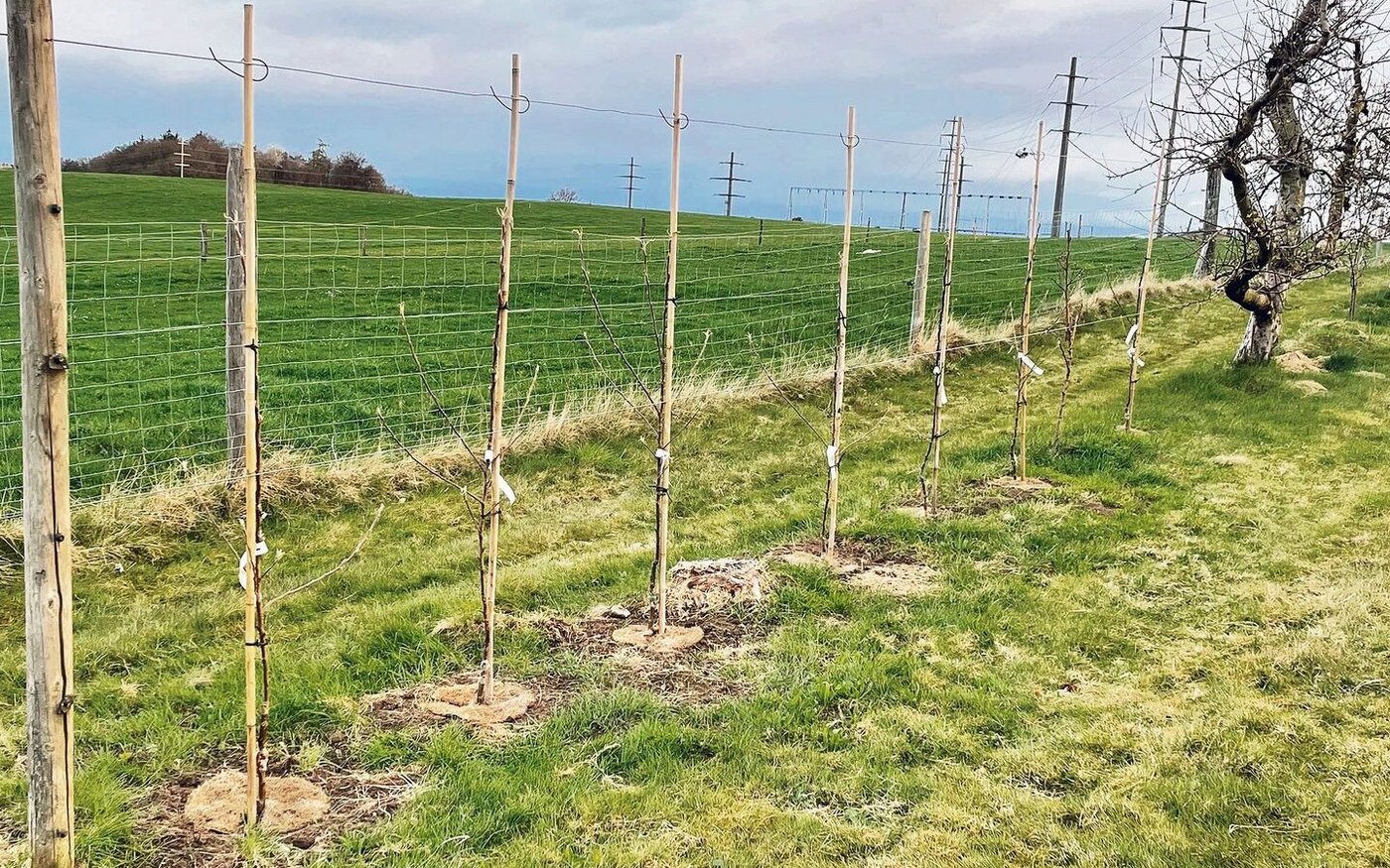 Ende März hatte ich eine ganz besondere Aufgabe zu erledigen. Ich durfte 13 Apfel- und zwei Birnbäumchen setzen. Dazu verteilte ich sie in einem gleichmässigen Abstand von 1,1 Meter und in einer geraden Linie in die Lücke der Obstplantage. Anschliessend grub ich mit einer Stechschaufel ein Loch für jedes neue Bäumchen.
