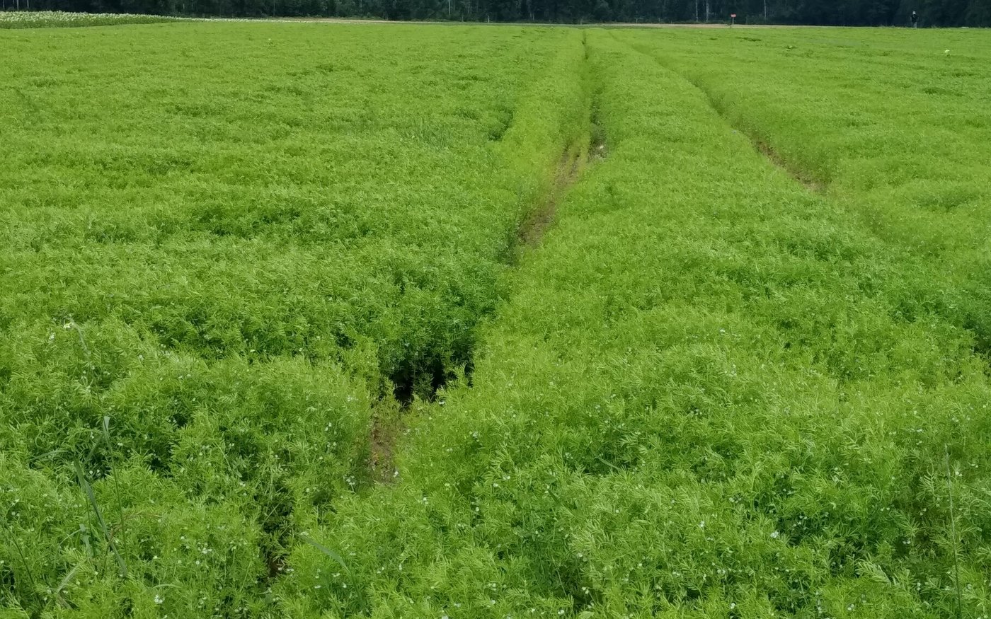 Dieses Jahr hat Simon Hauert Mitte März drei Hektaren Linsen in eine abgefrorene Gründüngung gesät. «Damit die Gründüngung trotz der schwachen Fröste eingeht, habe ich sie frostgewalzt», schildert er. Das Unkraut hielt er mit einem Vorauflaufherbizid in Schach, was für reines Erntegut wichtig ist. «Auf diese Weise muss ich nicht mit einem Striegel durch, wenn die Pflanzen noch sehr schwach sind, spare Treibstoff und Überfahrten», so seine Begründung. Schnecken seien ein Thema gewesen, wohl wegen der Überreste der Gründüngung. Zwar liefen die Linsen gut auf, allerdings erwies sich der Ölrettich aus der Gründüngung als sehr zäh und wuchs durch. «Ich weiss noch nicht, ob das bei der Ernte ein Problem wird», meint Hauert. Schwierigkeiten bereitete ihm bisher vor allem Klettenlabkraut, da dessen Samen kaum von reifen Linsen zu unterscheiden und daher schwer auszusortieren sind. Sein diesjähriger Versuch mit Kichererbsen als Stützkultur auf einer kleinen Fläche verlief bisher wenig erfolgreich: Wahrscheinlich werden die Kichererbsen nicht rechtzeitig ausreifen und es bräuchte eine höhere Saatdichte für eine bessere Stützfunktion.