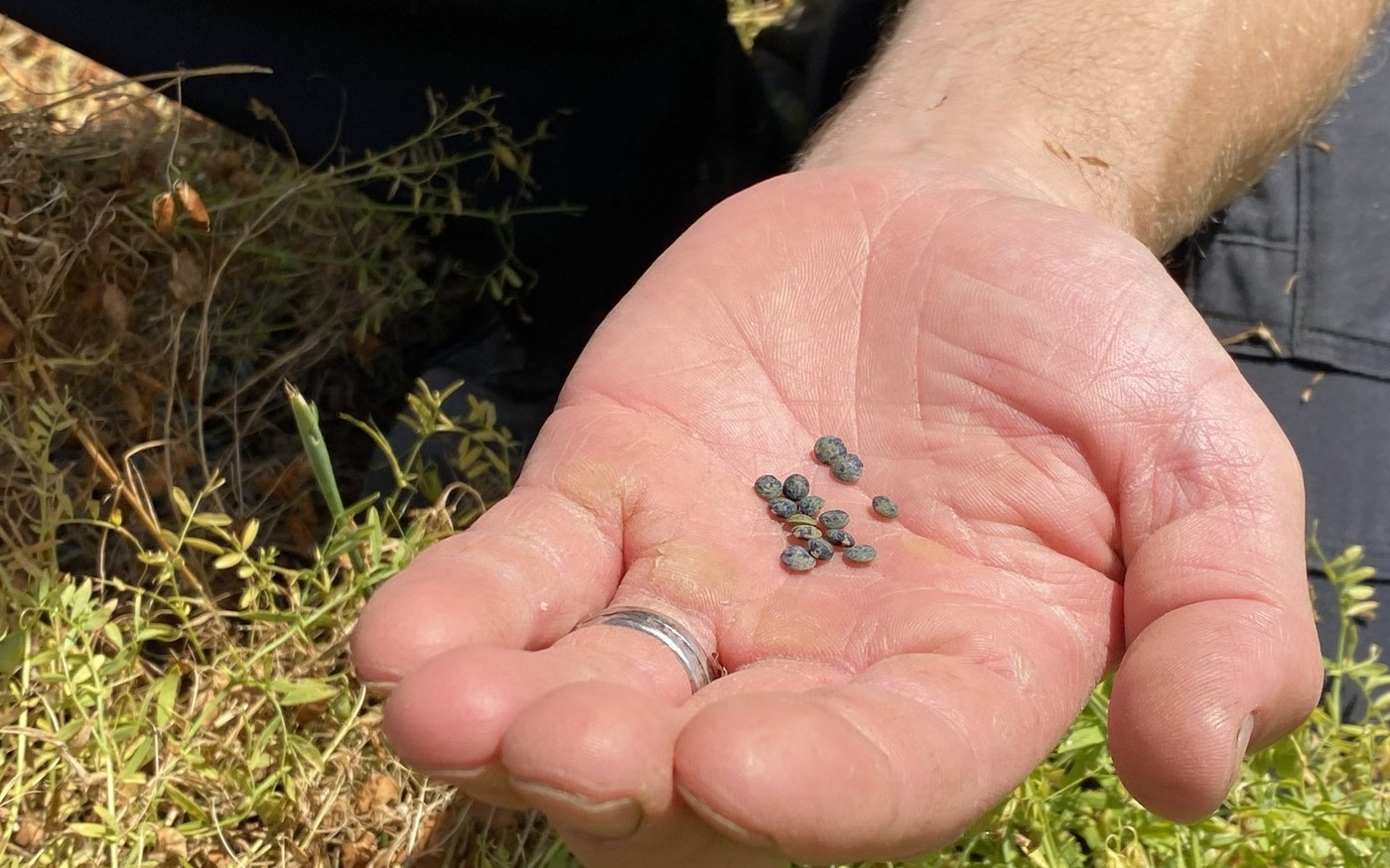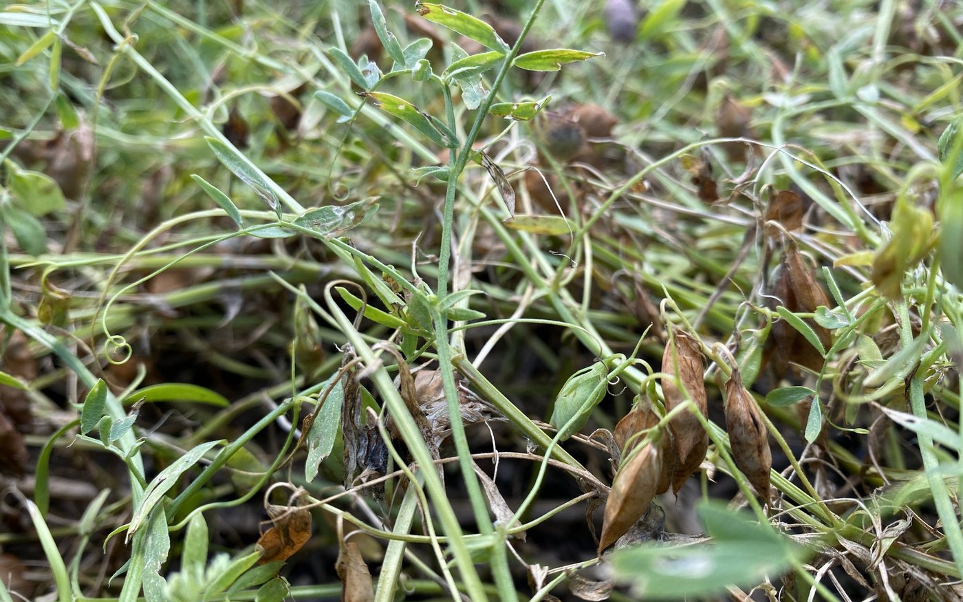 Der Starkregen Anfang Juli hat die Linsen niedergedrückt. Im unteren Teil sind die Pflanzen braun und trocken, die Körner reif. Anders sieht es weiter oben aus, wo Hülsen und Blätter noch lebendig grün schimmern. «Der Erntezeitpunkt ist sehr schwierig festzulegen», bemerkt Simon Hauert. Mit Krankheiten oder Schädlingen habe er bei den Linsen bisher kaum zu kämpfen gehabt, die Ernte aber sei eine Herausforderung: Sind die Hülsen zu trocken, gibt es viel Bruch und damit Verluste. Heuer hat der Regen bereits einige Linsen aus ihren Hülsen geschlagen, die nun ebenfalls verloren sind.