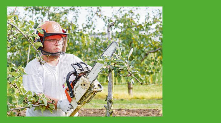 Nach der Ernte ging es rund 500 Apfelbäumen an den Kragen. Wir remontierten die über 17 Jahre alten Bestände von Cox Orange, Braeburn und Pinova und pflanzen als Ersatz Boskop und Elstar. Beim Cox Orange ging die Nachfrage zurück, das war auch ein Grund für die Rodung. Die Rodung erfolgt wiederum mit der Motorsäge. Zuerst entfernte ich bei allen Bäumen die Äste. Anschliessend schnitt ich den Stamm 30 cm über dem Boden ab. Die Äste haben wir vor Ort gehäckselt und liegengelassen, denn der Mulch gibt dem Boden wichtige Nährstoffe zurück. Die Baumstöcke haben wir maschinell ausgerissen und in die Biogasanlage gegeben. Dann kam der strengere Teil: die Neupflanzung. Mit einer Seitenfräse schnitten wir vorgängig einen Graben in den Boden. Aber das effektive Loch für den Wurzelstock musste ich mit der Schaufel graben. Das war schon ziemlich anstrengend und da habe ich mir das Feierabendbier redlich verdient.