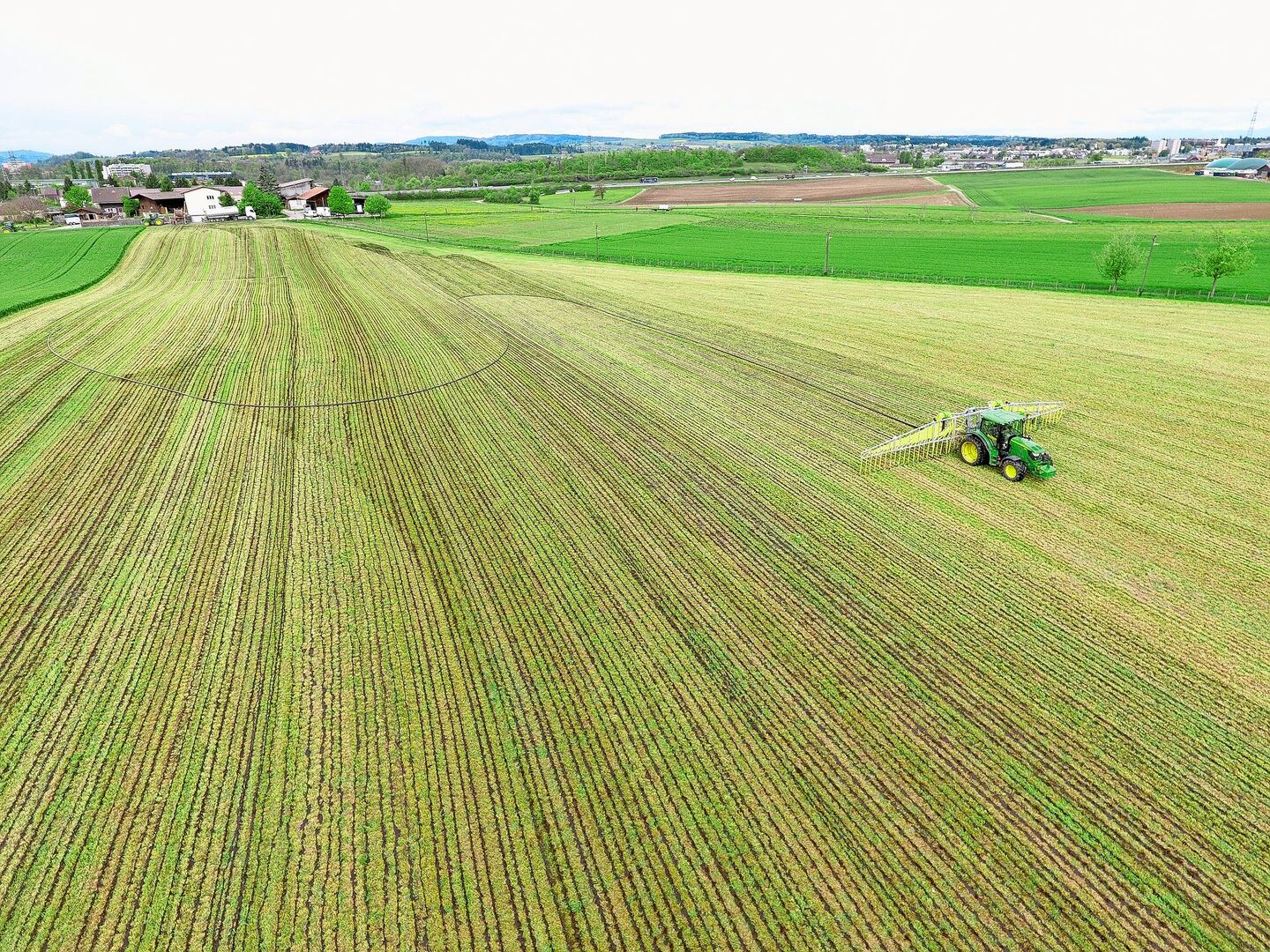 Von der Einspeisung der Anlage bis zur vollständig fermentierten Gärgülle vergehen 60 bis 90 Tage. Ist der Anteil an schwer abbaubaren Komponenten hoch, geht es länger, als wenn der Anteil an zuckerhaltigen Komponenten erhöht ist. Dabei passiert das Flüssigkeitsgemisch zwei Fermenter. Danach folgt die Nachgärung und endet schliesslich im Endlager. Das dabei entstandene Biogas kann gespeichert und bedarfsgerecht verstromt werden. Die Lagerkapazität der Biogasanlage beträgt 6000 m3. Von dort aus kann der organische Dünger eingesetzt werden. Dabei variiert der Preis pro m3 je nach Region. Im Frühling, bei kühleren Temperaturen, setzt Wyss auf das Ausbringen mit dem Schleppschlauch. Für ihn ist aber klar: «Das Minimum ist nicht gut genug, die Technik muss auf die Wetterbedingungen abgestimmt sein, um möglichst effizient zu güllen.» Bei wärmeren Bedingungen bevorzugt er den Schleppschuh und im Sommer bringt er die Gärgülle wenn immer möglich mit der Gülledrille aus.