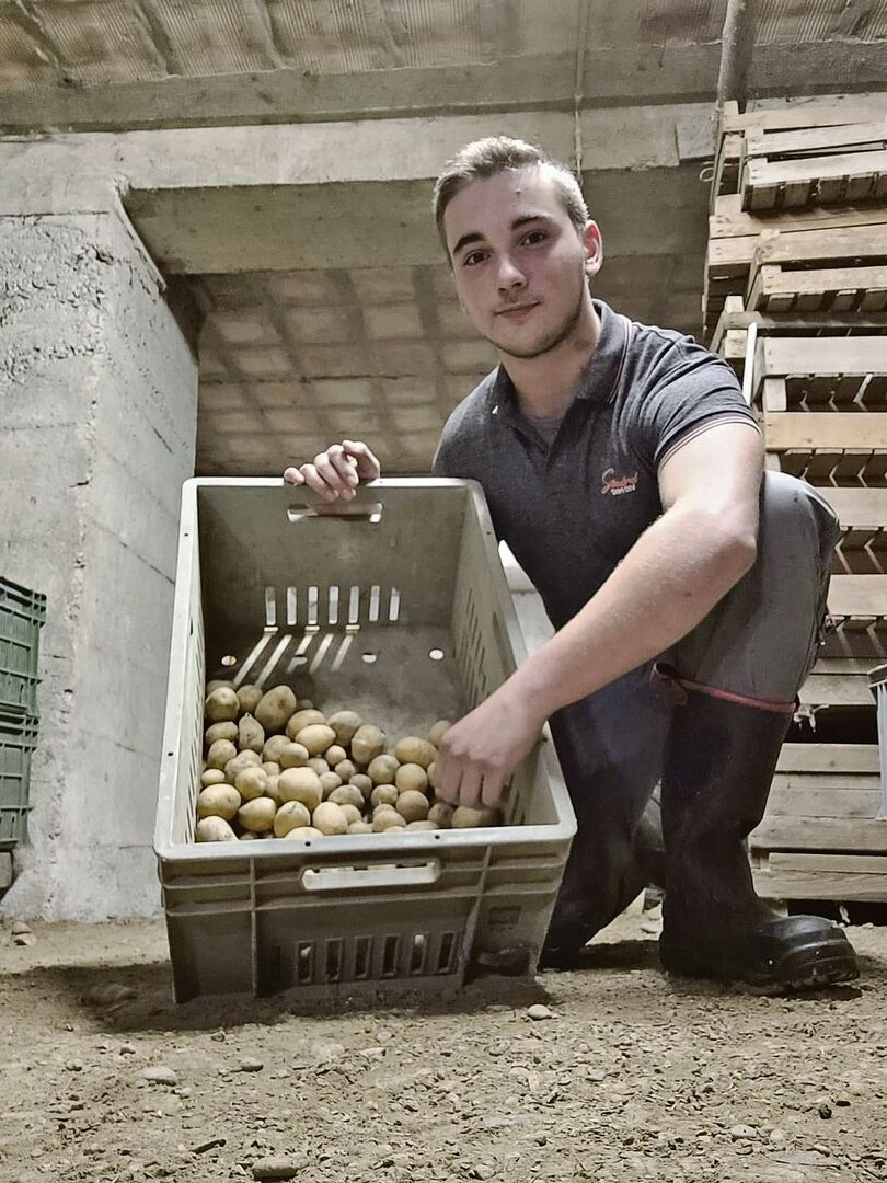 Der Fahrer muss auch gut auf die Personen hören, die sich auf der Erntemaschine befinden. Wenn es ein Problem gibt, müssen sich diese sofort bemerkbar machen. Meistens wurde dann einfach extrem laut «Ho!» geschrien, das war das Zeichen zum Stoppen. Die guten Kartoffeln fielen dann sanft vom Laufband in den Container. Wenn dieser voll war, wurde die Ladung mithilfe eines Förderbands in Paloxen abgefüllt. Ein Teil der Kartoffeln wurde direkt verkauft und der andere Teil füllen wir für Privatkunden in Säcke und Harassen ab.