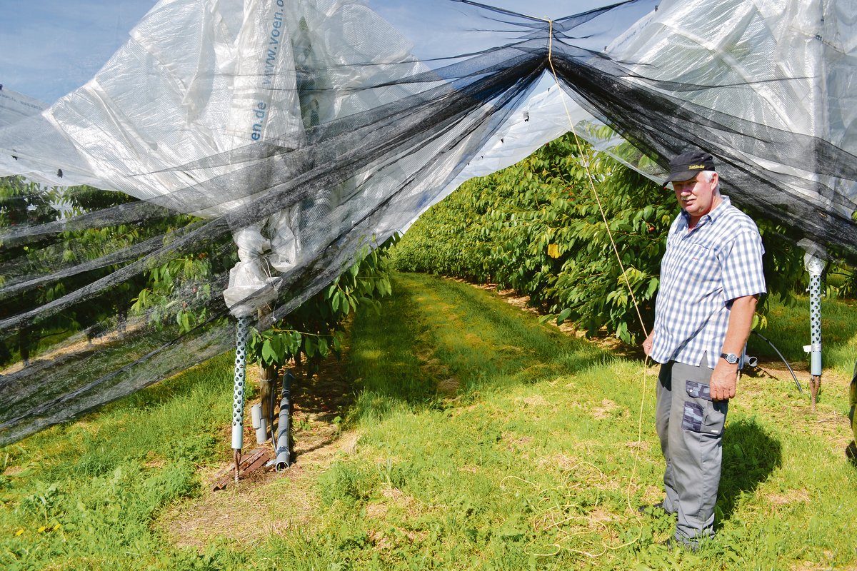 Nach der Ernte, wenn alle Kirschen aus der Anlage entfernt worden sind, stellt die KEF keine Gefahr mehr dar. Sie ist nur an reifen, gesunden Früchten für die Eiablage interessiert und überwintert an geschützten Orten ausserhalb der Kultur. Zu diesem Zeitpunkt können also die seitlichen Netze wieder entfernt oder eingerollt werden. Das sei wichtig, um das Material zu schonen: «besonders die Sonne, das UV-Licht schadet dem Plastik. Ausserdem können sich bei starkem Wind die Nähte lösen», führt der Obstbauer aus. Maximal zehn Jahre Lebensdauer schätzt er für die Netze. Somit muss bei einer durchschnittlichen Erhaltungszeit von 20 Jahren für eine Kirschenplantage mit zwei Garnituren gerechnet werden. «Die Anschaffung der KEF-Netze ist mit 80 Rappen pro m2 zwar nicht gross, aber es gibt schon zusätzliche Arbeit», meint Helbling. Allerdings unterstützt der Kanton Bern im Rahmen des Berner Pflanzenschutzprojekts die seitliche Einnetzung mit 1000 Franken pro Hektare und Jahr.