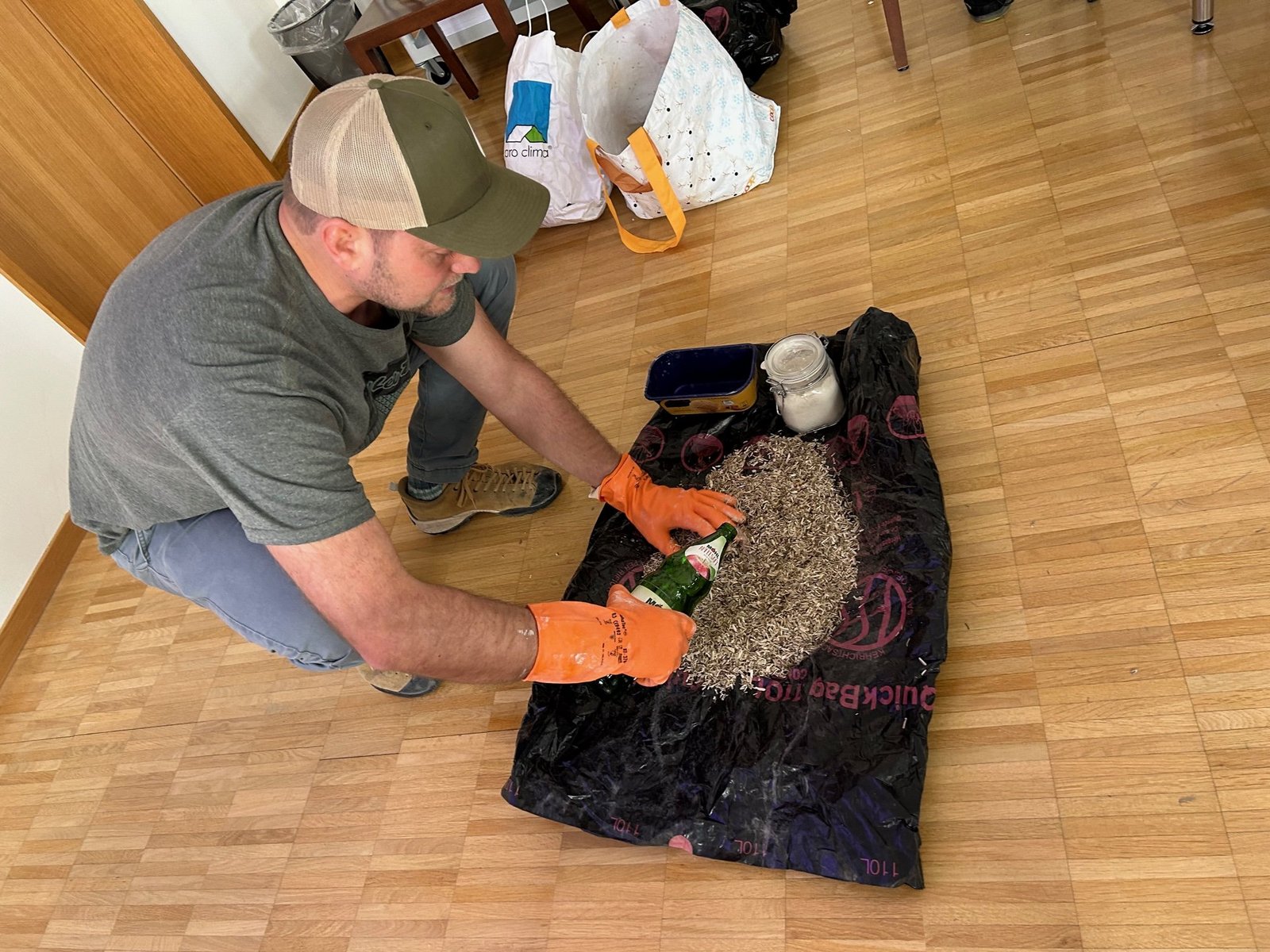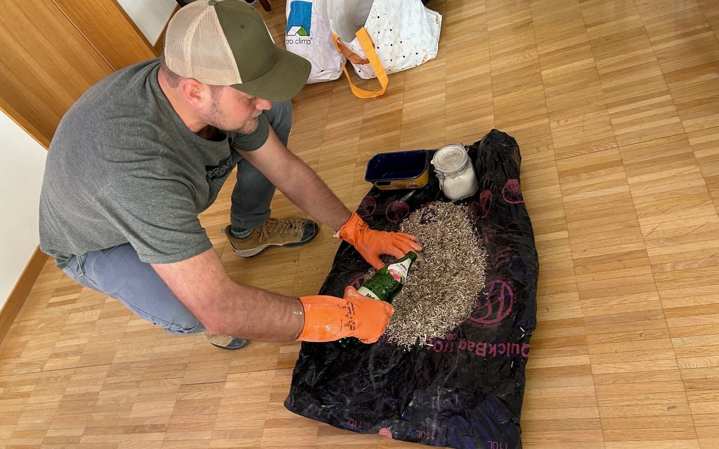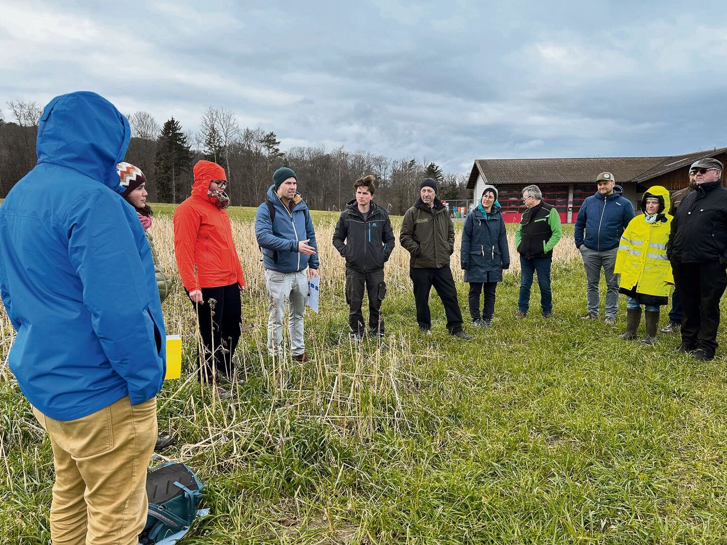 Bei diesem Thema verwandelte sich die Flurbegehung in einen Netzwerkanlass. Mit Landwirten, die sich für den Hanfanbau interessieren. Thomas Streule von der Firma Hanfhandwerk GmbH aus Mels war dabei und demonstrierte, wie sich aus den Holzteilen der Hanfstängel (Schäben) mit Kalk und Wasser vermischt Hanfsteine als Baumaterial herstellen lassen. [IMG 2]