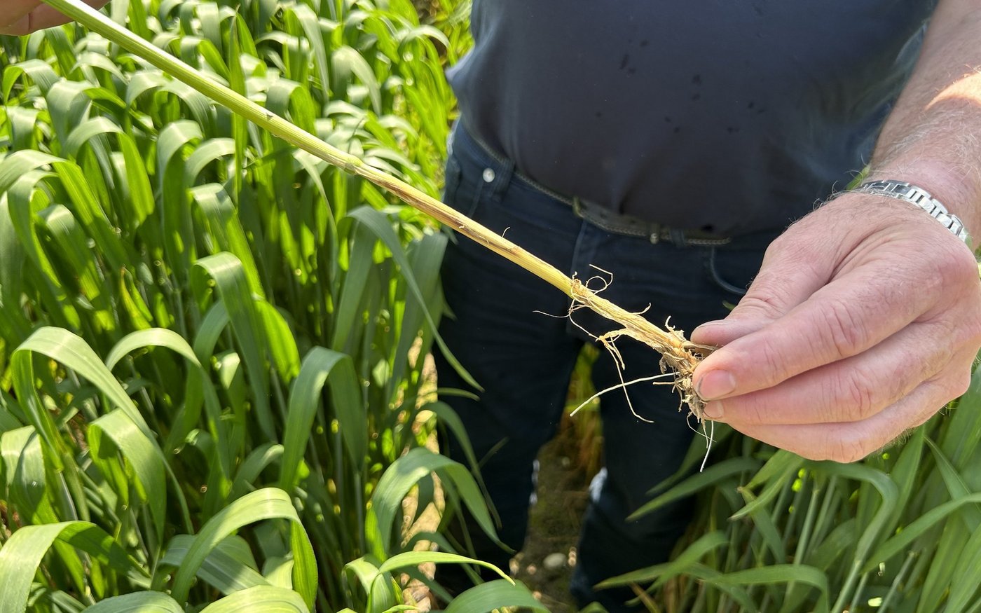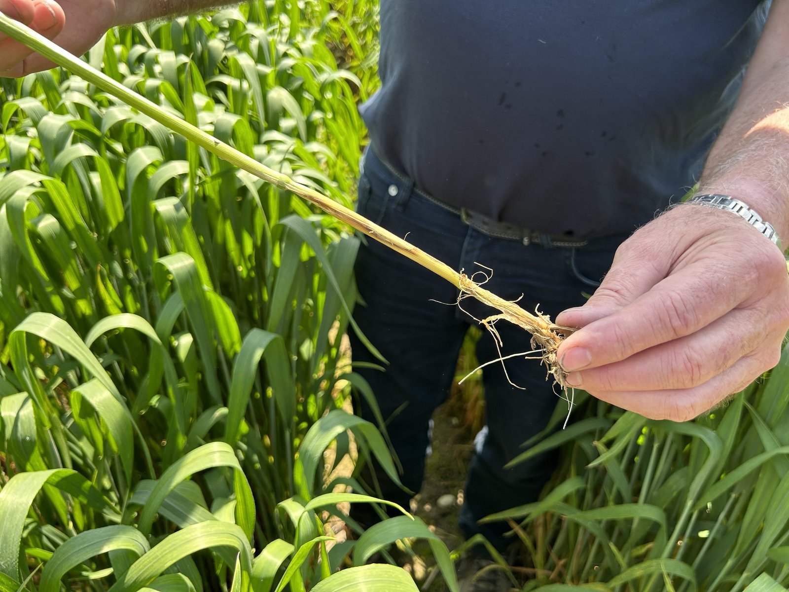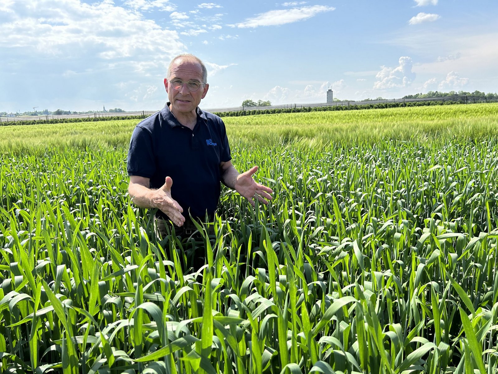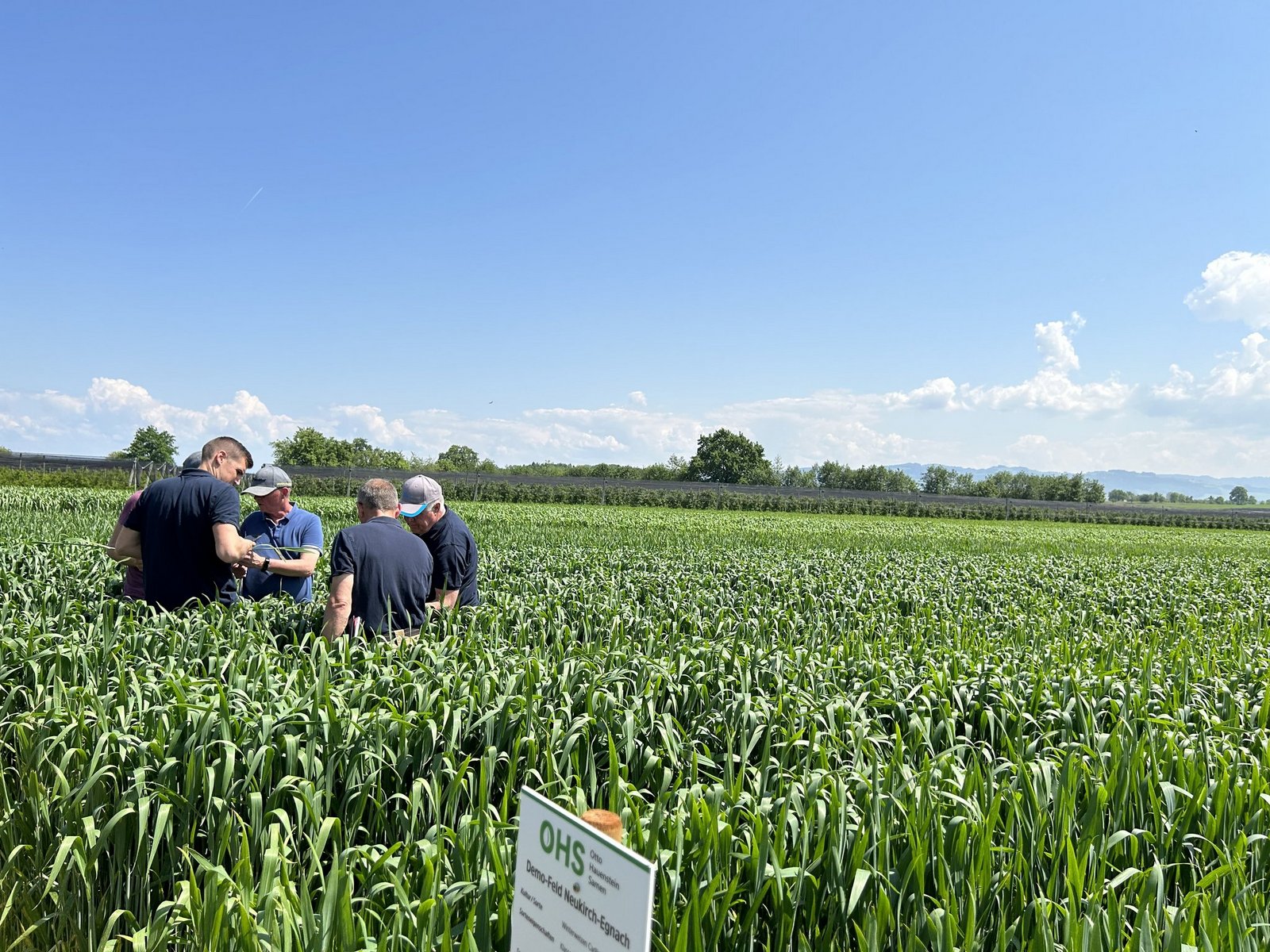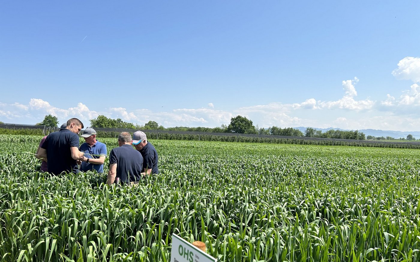 Freude hatten die Teilnehmer des Flurgangs am Hybridweizen Hymonta. Dieser ist sehr bestockungsfreudig. Hymonta ist noch nicht auf der Liste der empfohlenen Sorten, sondern erst im Prüfverfahren – wird also noch als Futterweizen abgenommen. «Im Ausland ist die Sorte als Brotweizen zugelassen», erklärt Bernhard Zuber von OHS.