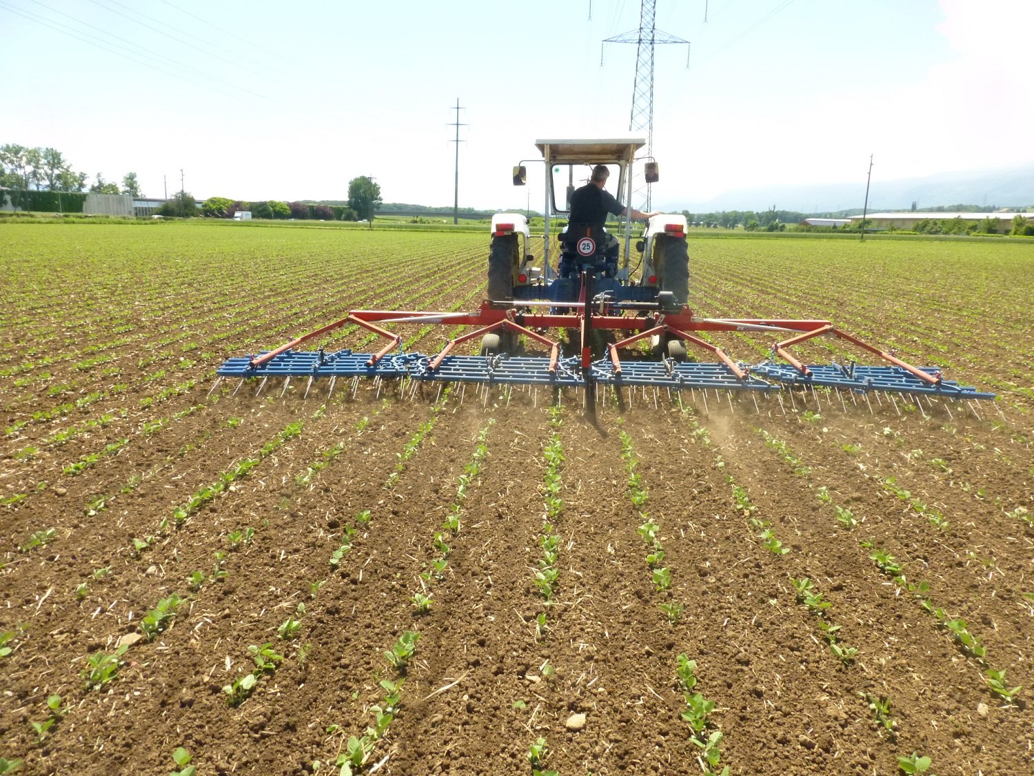 Haben die Sojapflanzen das erste Blattpaar gebildet, kann die Kultur mit wenig Zinkendruck erstmals mit dem Striegel bearbeitet werden. Zu einem früheren Zeitpunkt würden die Keimblätter und damit die Pflanzen nachhaltig beschädigt. Dank des sehr geringen Zinkendrucks und einer maximalen Geschwindigkeit von 4 km/h kann eine Verletzung der Sojapflanzen vermieden werden. Neben dem Striegel ist auch ein Einsatz der Rollhacke zur Unkrautregulierung möglich.