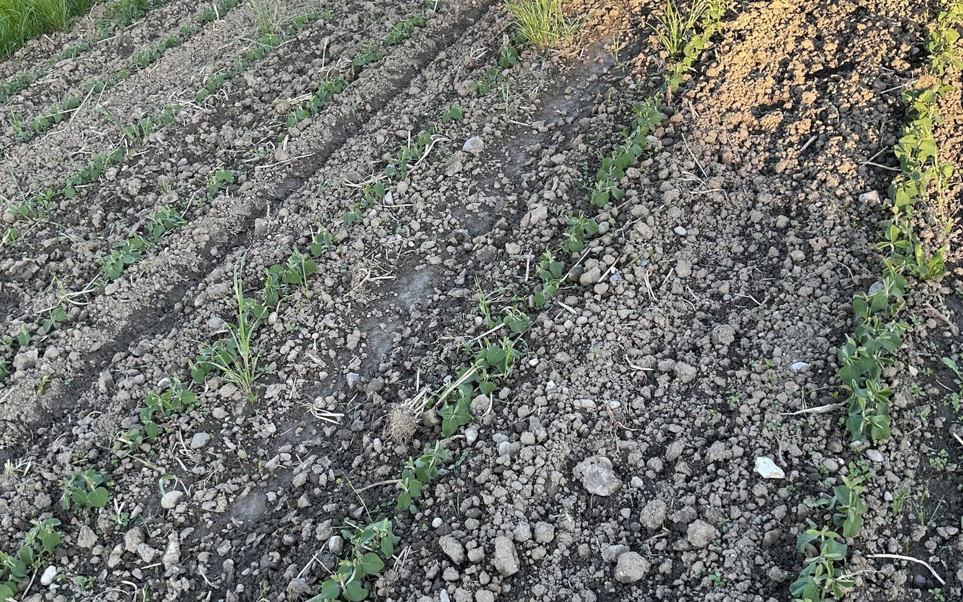 In diesem Jahr pflügte Schär am 30. April flach, bereitete am 1. Mai das Saatbeet vor und säte am 2. Mai die 520 000 Kö/ha an. Er wählte die Sojasorte Aurelina, die relativ früh heranreift, sodass er im Idealfall ab Mitte September ernten kann. Der Pflanzabstand ist mehr als nur dicht, denn Schär säte vier Reihen auf drei Meter. Nach der Saat folgte ein zweimaliger Blindstriegeldurchgang. Zwischen den Reihen, auf dem 75 cm breiten Streifen, säte er diese Woche mit dem Kleinsamenstreuer noch Speisehirse an, die er einstriegelte. [IMG 2] «Letztes Jahr spross die Hirse und anderes Unkraut zwischen den Reihen. Jetzt säe ich direkt Speisehirse ein», sagte er. Er wisse von Kollegen, dass es funktioniere, und hätte sich mit dem Lohnunternehmer wegen dem Dreschen abgesprochen. Gedroschen wird in einem Durchgang und nachfolgend werden Hirse und Soja separiert. Links und rechts des 18 m breiten Sojaackers wächst je 6 m Kunstwiese. Dann folgt wieder ein Sojastreifen.