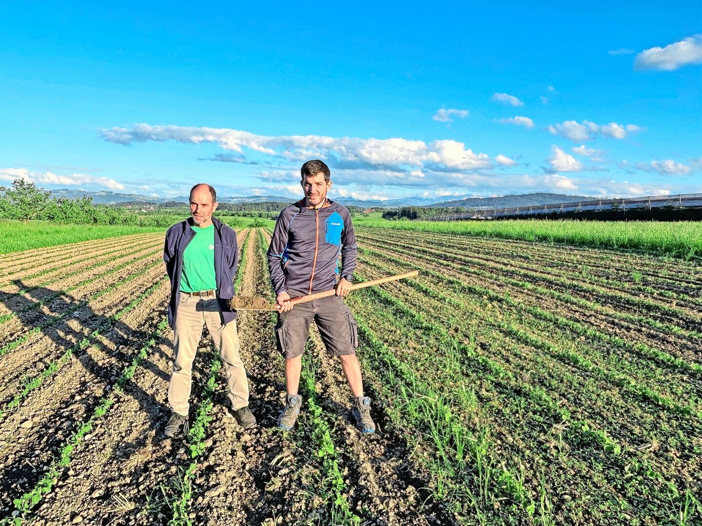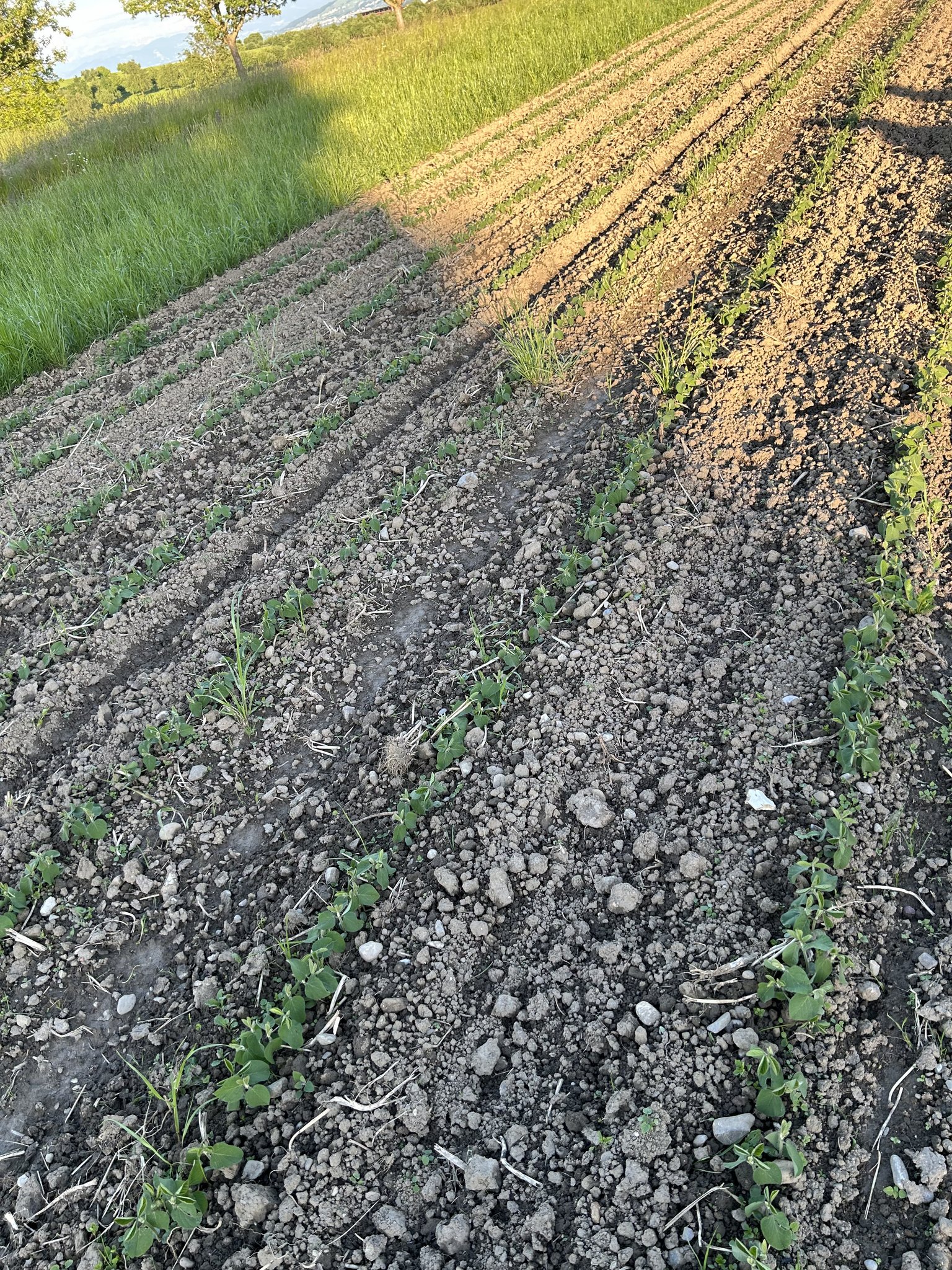 Diesen Frühling hatte diese Wiese noch eine ganz andere Funktion. Da die Gründüngung dermassen üppig gewachsen sei, mähte er diese, schwadete sie auf den Wiesenstreifen, liess den Kompostzerkleiner drüber und transportierte das Grüngut als Transfermulch zum Kartoffelfeld.