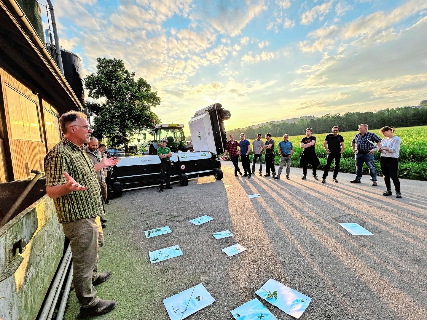 Eine davon präsentierten Christian Tschirren und Andreas Hasler von der Landi Thula. Auf dem Hofplatz von Thomas Burgdorfer stand in ihrer ganzen Pracht die Präzisionsspritze Ara der Firma Ecorobotix. Die an einem Traktor angebaute Spritze erkennt Unkräuter mittels Bildanalyse und behandelt sie punktgenau mit einem Pflanzenschutzmittel. Bisher wurde der Ara für die gezielte Bekämpfung von Blacken verwendet. Seit diesem Jahr wird er aber auch in Zwiebel- und Karotten eingesetzt. «Wir sammeln erste Erfahrungen», sagte Christian Tschirren (Leiter Agrar Landi Thula). Die Vorteile liegen auf der Hand: So könne man bis zu 90 Prozent Pflanzenschutzmittel einsparen.