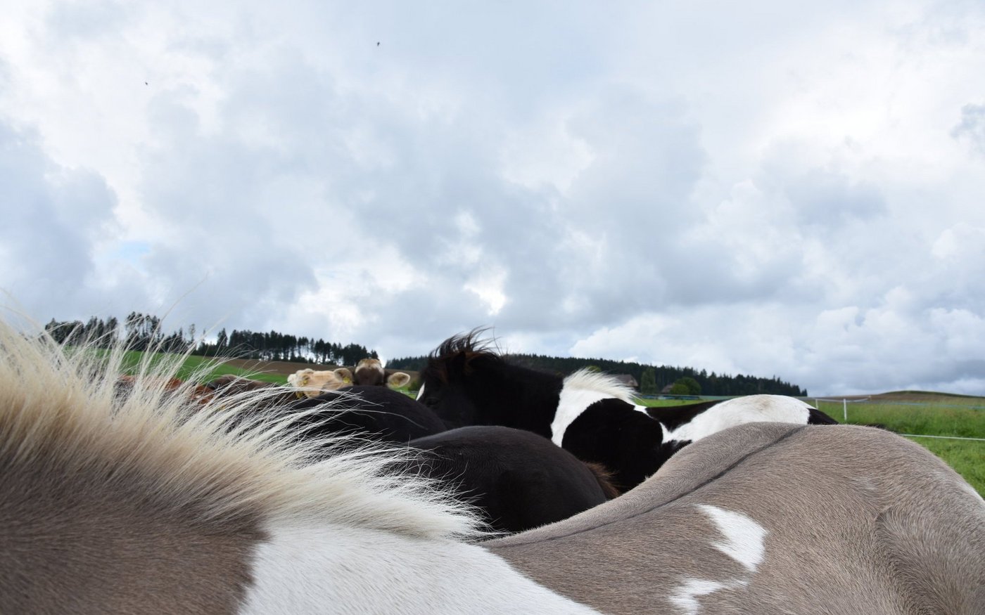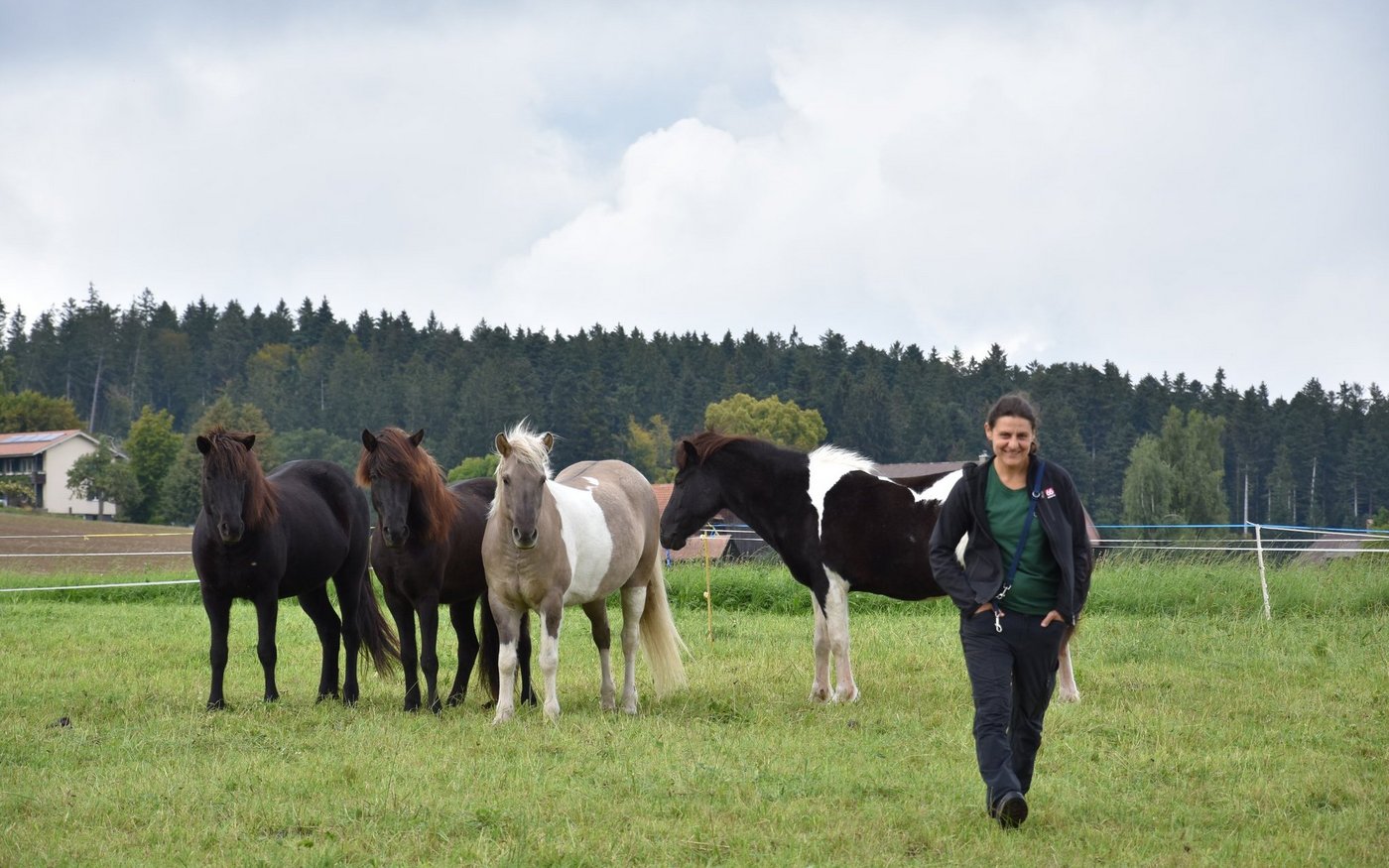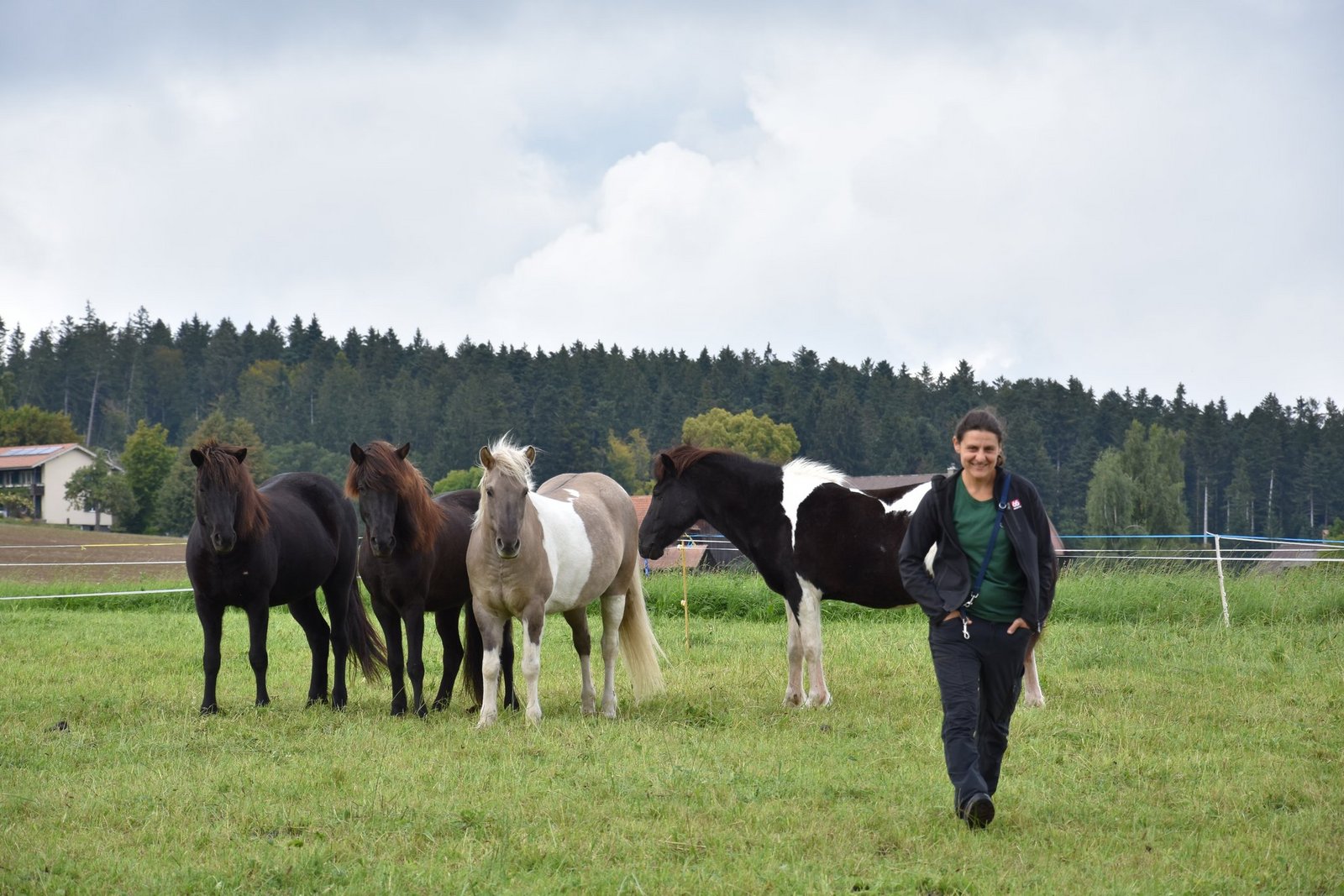 Astrid Michel hält im kleinen Dorf Zimmerwald im Kanton Bern vier Islandpferde. Überall hängen Kleber mit der Aufschrift «Islandpferdehof Wald». «Meine Schwägerin hat das Sujet entworfen, darum sind wir so gut angeschrieben», scherzt die Tierärztin. Drei Hektaren Weide und gut 200 m2 Fläche umfasst der Islandpferde-Offenstall, zu dem auch eine bunt gemischte Mutterkuhherde gehört. Die Pferde teilen die Weide sogar mit den Kühen. «Die Pferde ziehen der Kuhherde hinterher, das ist eine optimale Weidepflege», beobachtet Astrid Michel und zeigt den zwei Experten stolz ihre kleine Herde.