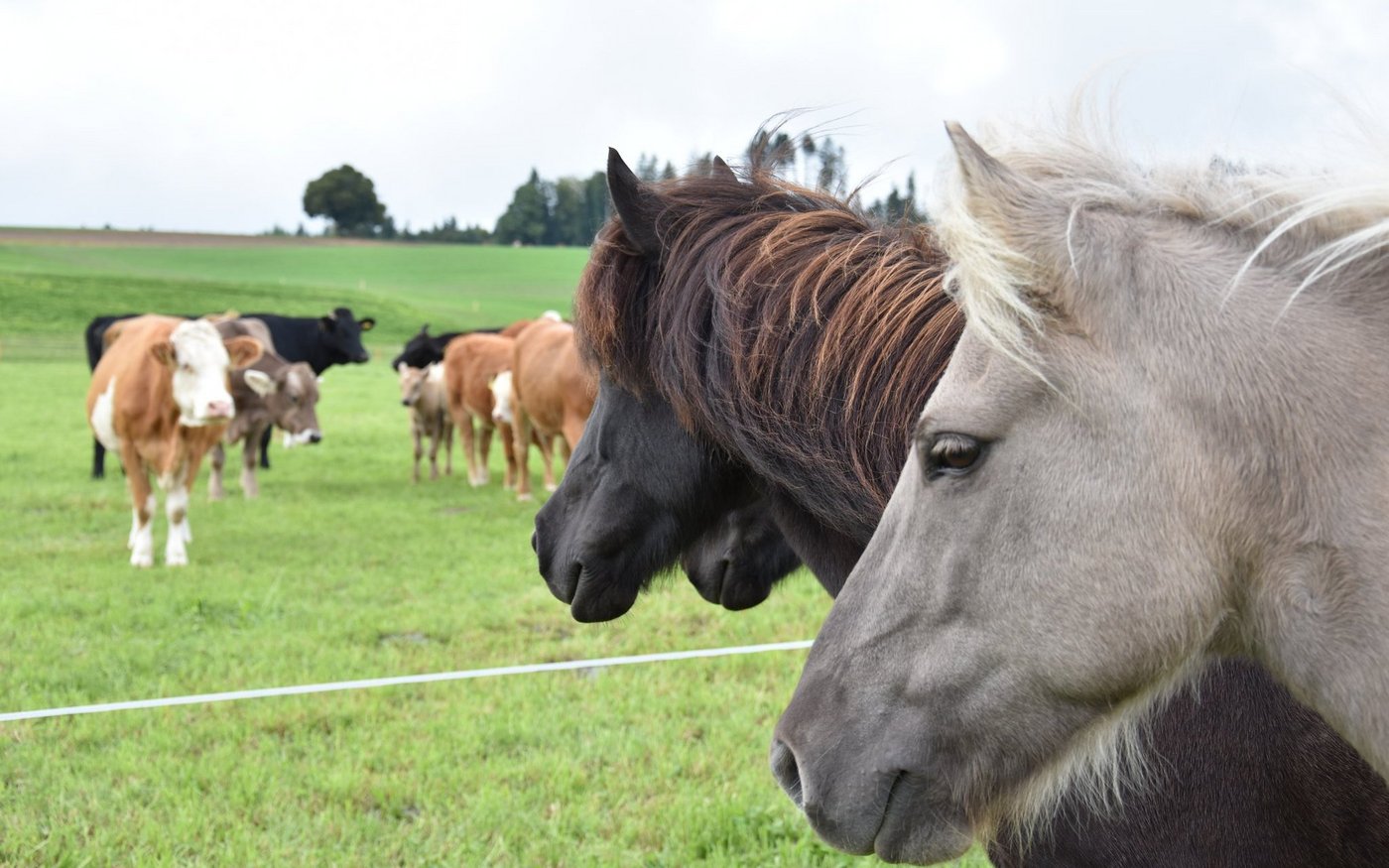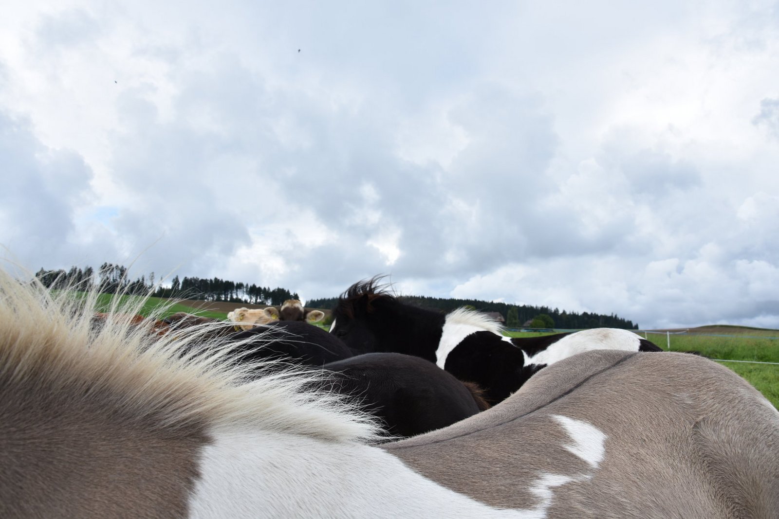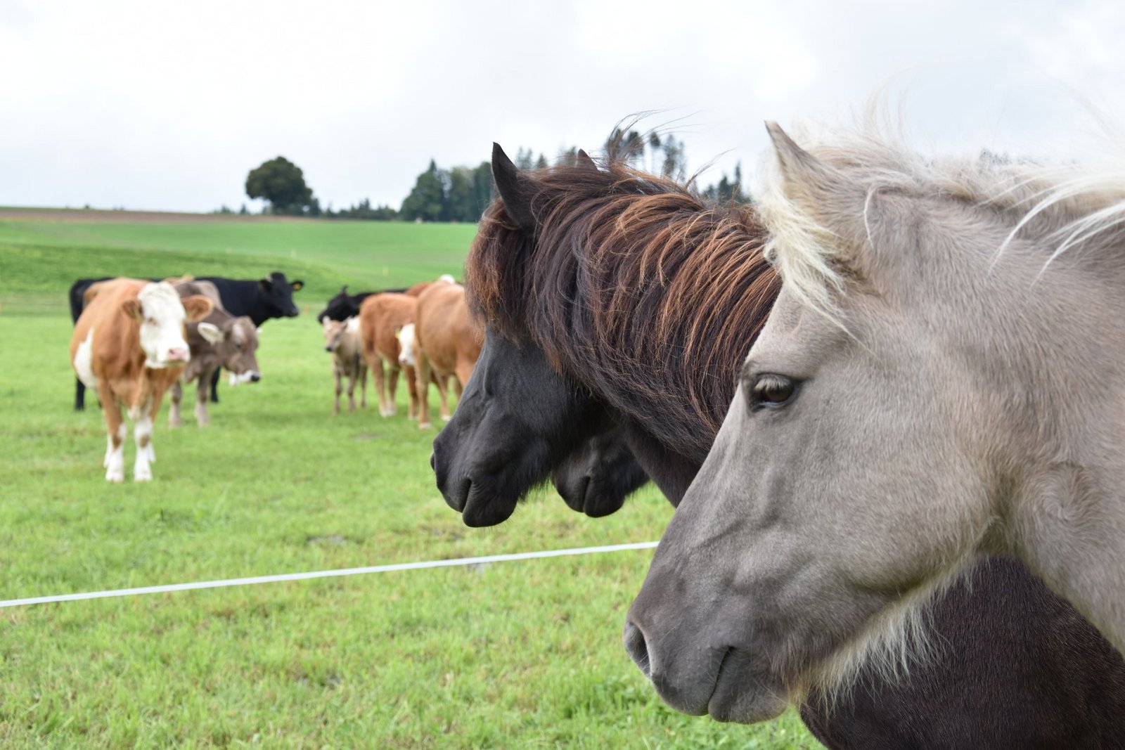 Astrid Michel hält im kleinen Dorf Zimmerwald im Kanton Bern vier Islandpferde. Überall hängen Kleber mit der Aufschrift «Islandpferdehof Wald». «Meine Schwägerin hat das Sujet entworfen, darum sind wir so gut angeschrieben», scherzt die Tierärztin. Drei Hektaren Weide und gut 200 m2 Fläche umfasst der Islandpferde-Offenstall, zu dem auch eine bunt gemischte Mutterkuhherde gehört. Die Pferde teilen die Weide sogar mit den Kühen. «Die Pferde ziehen der Kuhherde hinterher, das ist eine optimale Weidepflege», beobachtet Astrid Michel und zeigt den zwei Experten stolz ihre kleine Herde.