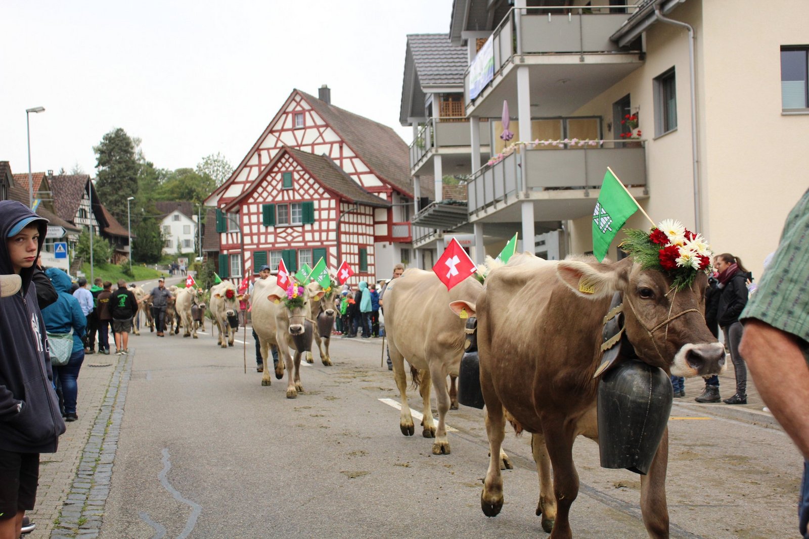 Auch Appenzeller Bauernfamilien leben in der Gegend und kamen traditionell daher mit Geissen, Geissbuben und -mädchen voraus. Die vier Sennen hinter den Schellenkühen gaben mit Zäuerli und Juchzer ihrer Freude Ausdruck, wie es sich gehört.