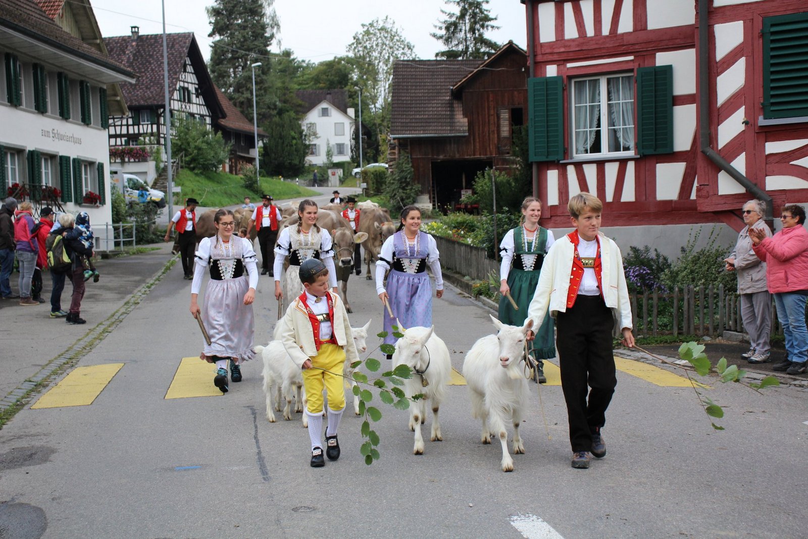 Glockengebimmel und Muhen kündigte schon von weitem die ersten Gruppen an. Vom Nollen, vom Hosenruck, aus Istighofen, Wuppenau, Heiligkreuz und natürlich aus Schönholzerswilen kamen die 20 Gruppen mit festlich herausgeputzten und geschmückten Tieren, mit Bauern, Bäuerinnen und Kindern, nicht minder herausgeputzt mit Blumen in den zu Zöpfen geflochtenen Haaren und in Festtagstrachten gekleidet.