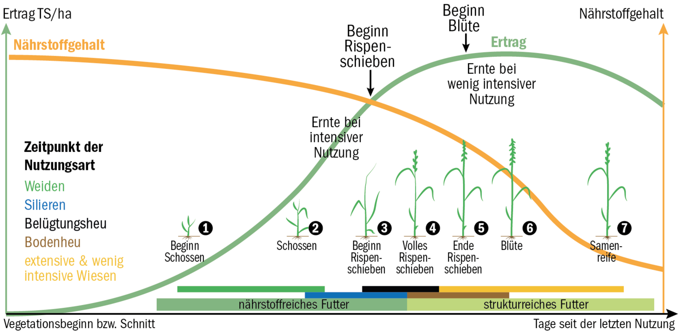 Ein optimaler Nährwert mit einem angemessenen Ertrag wird erreicht, wenn 10 bis 50 Prozent der Ähren oder Rispen sichtbar sind (siehe Grafik). Beim Heuen können diese beiden Entwicklungsstadien 3 und 4 auch abgewartet werden, was zu grösseren Mengen strukturreicherem Futter mit tieferen Nährstoffgehalten führt. Siliert wird häufig früher im Stadium 2 bis maximal 4, um Futter mit hohen Nährstoffgehalten, jedoch nicht maximalem Ertrag zu erhalten.