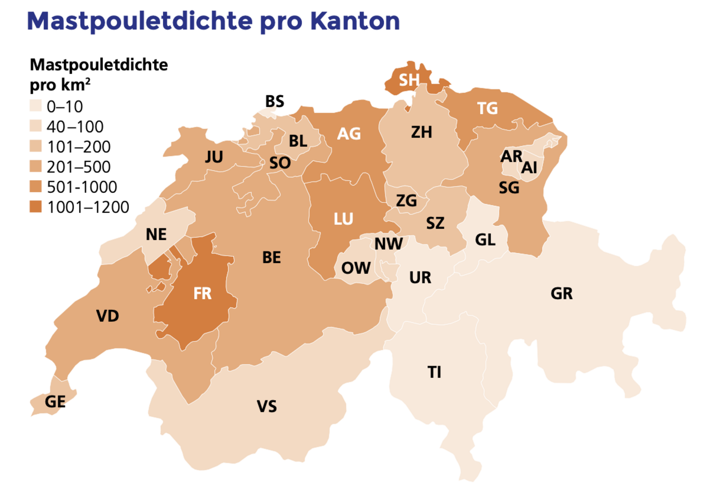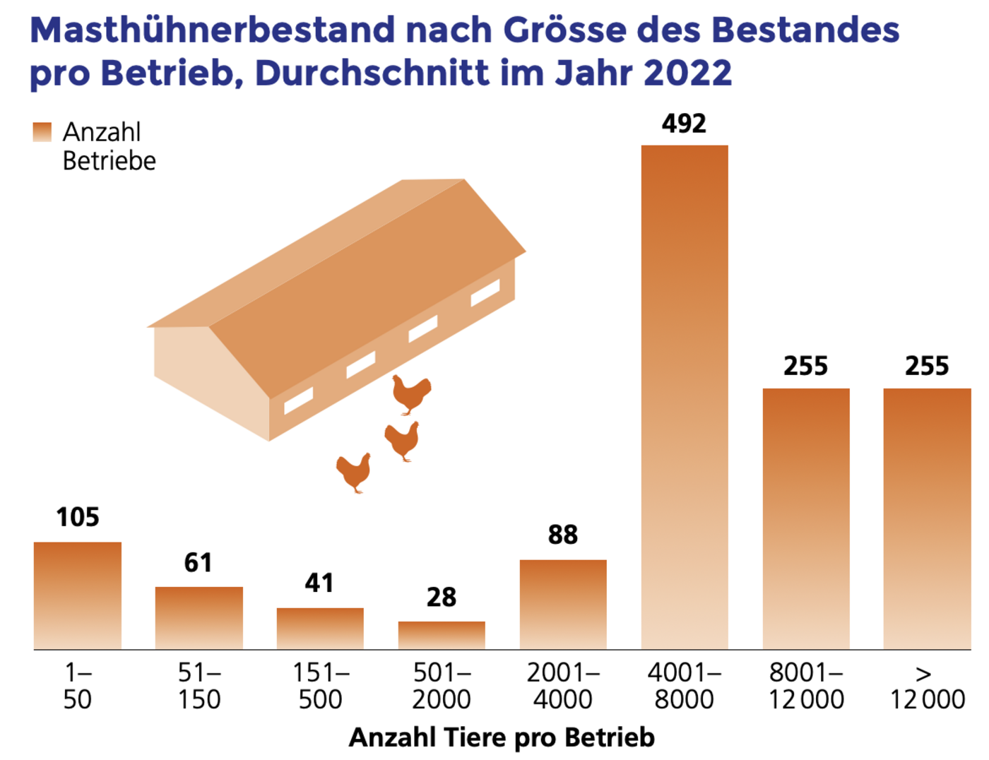 Zur selben Zeit stieg auch die Produktion der Schweizer Geflügelproduzenten stark an. Laut Bundesamt für Statistik produzierte die Schweiz 2003 etwa 56 000 Tonnen Poulet (verwendbare Produktion), zwanzig Jahre später waren es etwa 110 000 Tonnen (verwendbare Produktion) – eine glatte Verdoppelung. Neben der einheimischen Produktion werden jährlich mehr als 40 000 Tonnen Poulet aus dem Ausland importiert. Knapp die Hälfte davon stammt aus Brasilien, danach folgen Ungarn, Frankreich und Deutschland.