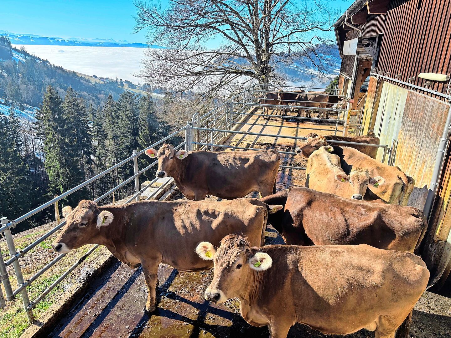 Der Weg zum Hof von Res Büeler im St. Gallischen Rüeterswil ist steil und eng. Schon am Telefon hat der Landwirt erklärt: «Wenn du denkst, du bist ganz sicher falsch, weil die Strasse so steil wird, bist du genau richtig.» Während in den Dörfern unterhalb dicker Nebel herrscht, wird man auf dem Betrieb mit strahlend blauem Himmel und Sonnenschein belohnt. Das Rindvieh hat vom Auslauf einen Weitblick bis in die Luzerner Alpen und ins Mittelland.