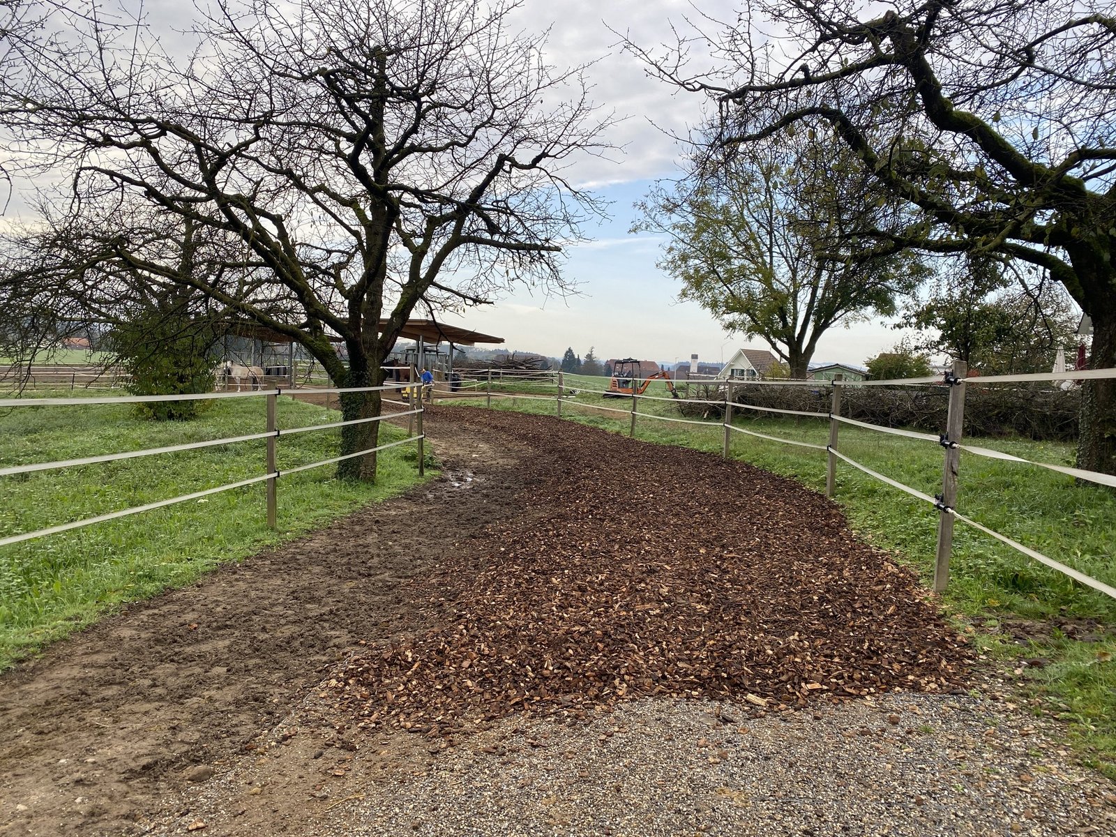 Der mit Ecoraster unterlegte Paddock-Trail ist ein zentrales Element der Anlage. «Damit wollen wir die Wanderrouten der Wildpferde simulieren», erklärt Gabi Winistörfer, während sie die verschiedenen Abschnitte des Pfades zeigt, die teils relativ grobe Steine enthalten. Andernorts haben die Pferde die Möglichkeit, über Holzschnitzel, feine Rundkieselsteine oder Sand zu gehen. «Tatsächlich wählen einige Pferde ab und zu die groben Steine – das ist gut für die Resilienz der Hufe», beobachtet die Verhaltenstherapeutin.
