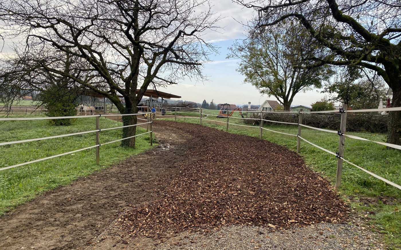Nach einer langen Planungsphase wurde das Projekt gutgeheissen, unter der Bedingung, dass die alten Obstbäume wegen der Instandhaltung des Landschaftsbildes stehen bleiben. «Also bauten wir rundherum. Drei junge Obstbäume haben wir sogar versetzt», so Jürg Leuenberger. Tatsächlich sind die grosse Liegehalle mit Fotovoltaikanlage, der Sand-Reitplatz (20 × 30 m) mit Unterflurbewässerung, der lange, fünf Meter breite Trail und die zwei gedeckten Heuraufen in die Hostett eingebunden.