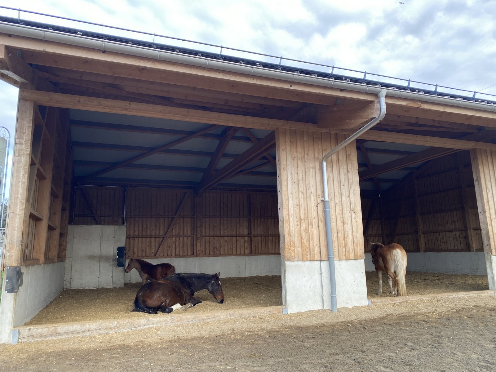 «Das ist so, die Initiative für das Errichten eines Bewegungsstalls kam ganz klar von Gabi», sagt Jürg Leuenberger nach der Besichtigung der Anlage mit einem Kaffee in der Hand, Sonne im Gesicht und sichtlich zufrieden, wie alles rausgekommen ist. «Aber die Planungsphase war langwierig», erinnert sich Jürg Leuenberger zurück, denn diese ist in der Tat schon eine Weile her. «Vor sieben Jahren hatte ich die Idee, fünf Jahre haben wir geplant und Gesuche gestellt – gebaut haben wir schliesslich vor zwei Jahren», so Winistörfer.