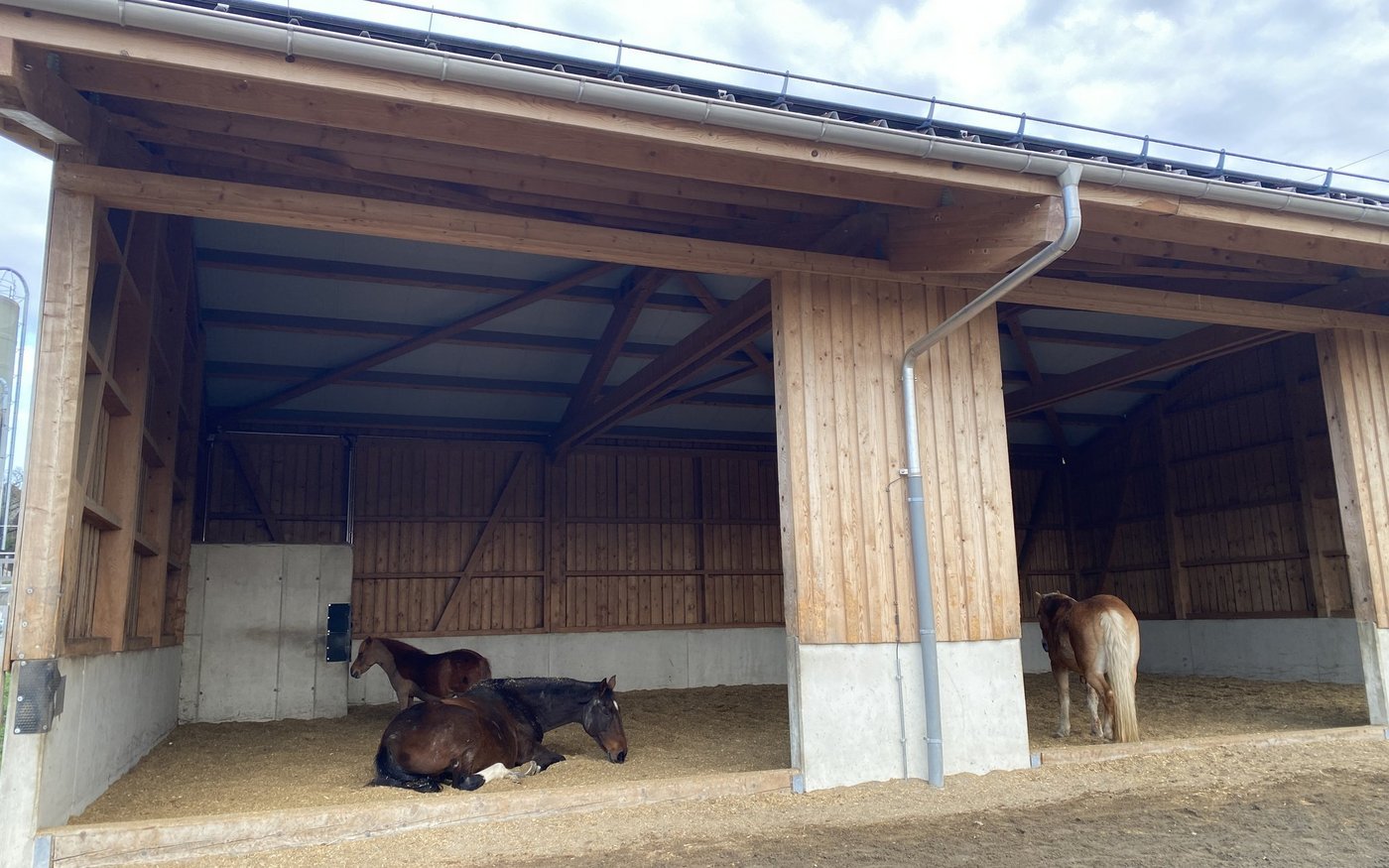 Die Idee, eine möglichst naturnahe und artgerechte Pferdehaltung anbieten zu können, schwebte Gabi Winistörfer schon lange im Kopf rum. Auch die Tätigkeit der Stiftung Pro Pferd, artgerechte Pferdeställe auszuzeichnen, verfolgte sie von Anfang an und hat sich nun dieses Jahr für die Auszeichnung mit dem Gütesiegel «Der Gute Stall» angemeldet (Beurteilung ausstehend). Als sie dann vor einigen Jahren das Haus ihrer Grosseltern im ländlichen Subingen (Kanton Solothurn) übernehmen konnte, zügelte sie schon etwas näher an diesen Traum. «Ohne den Zusammenschluss mit meinem Nachbarn Jürg Leuenberger wäre das Projekt jedoch nie umsetzbar gewesen», weiss die Pferdespsychologische Verhaltenstherapeutin.
