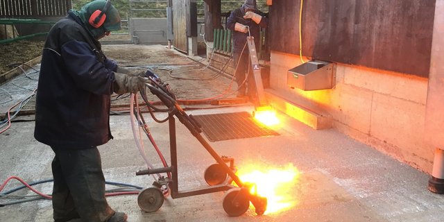 Baufirmen mit mangelndem Fachwissen haben leider dem Ruf des Gussasphaltbodens geschadet. Falsche Bestandteile und Zusammensetzungen sowie unsachgemässer Einbau führten zu Belagsschäden und Folgekosten bis hin zu Schäden an den Tieren. Infolgedessen wurde immer mehr mit Betonbelägen und Gummimatten gebaut. Schade. Zum Glück gibt es wieder Bauprofis, die Gussasphalt sehr sorgfältig und fachmännisch einbauen. Mehrere Punkte sind zu beachten. Die Gesteinskörnung und die Qualität des Bindemittels Bitumen als auch die Mischanteile (rund 93 % Steinanteil und 7 % Bitumen) sind entscheidend. Die Verarbeitungstemperatur liegt bei rund 220 °C. Deshalb sind nicht hitzebeständige Kotbalken aus bspw. recyceltem Kunststoff nicht ideal.
