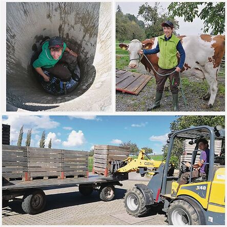Mein zweites Lehrjahr absolviere ich in der Betriebsgemeinschaft Augstburger/Wittwer in Gerzensee (Kanton Bern). Zum Betrieb gehören 60 ha Land und 20 ha Wald. Es ist ein vielseitiger Ackerbau- und Milchwirtschaftsbetrieb mit 40 Milchkühen, Aufzuchtkälber und Mastkälber. Normalerweise beginnt mein Tag um 5.30 Uhr. Als erstes hole ich die Kühe von der Weide, tränke die Kälber und wasche den Milchautomaten der Mastkälber. Auch die Kühe zu füttern, gehört zu meinen Aufgaben. Das Melken übernimmt am Morgen einer meiner Chefs. Danach bringe ich die Milch in die Weichkäserei in Gerzensee. Nach dem Frühstück dürfen die Kühe auf die Weide. Heute haben wir vier Galtkühe ausgetauscht, dazu durfte ich den Viehtransporter holen. Zwei der Kühe kamen auf den Betrieb Rüttigässli, wo auch die Aufzuchtrinder sind. Die anderen zwei Kühe kamen auf den Betrieb Seescheuer, dort sind unsere Milchkühe. Am Nachmittag habe ich das Reservoir ausgeputzt, welches vom heftigen Unwetter viel Schmutz drin hatte. Da schon bald die Kartoffelernte ansteht, haben wir die Anhänger mit Paloxen beladen.