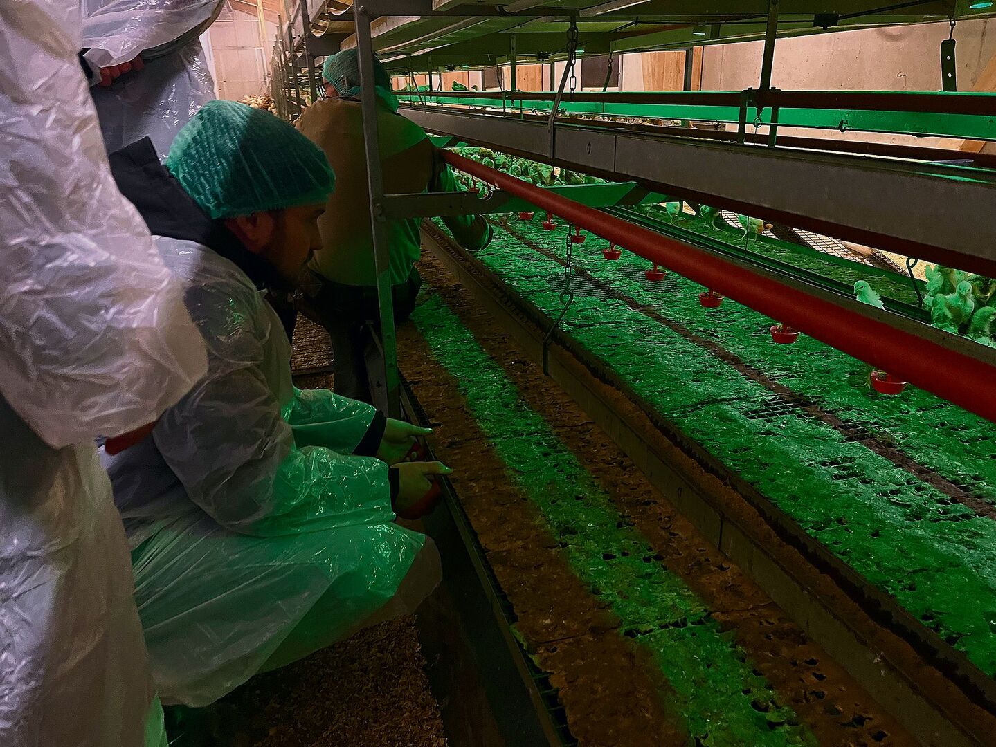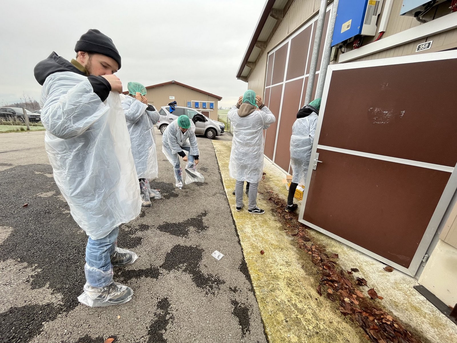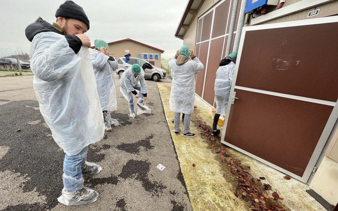 Im Stall wird auf Hygiene geachtet. Aus diesem Grund mussten wir uns ganz in Plastik hüllen. Milben, Viren, Bakterien und Parasiten können den Hühnern zu schaffen machen. Trotz diesen Massnahmen und regelmässigen Impfungen können die Hühner krank werden. Wussten Sie, dass sie seit vielen Jahren gegen Corona geimpft werden? Trotzdem haben wir beim Besuch ein unverkäufliches Ei gesehen, das von einem an Corona erkrankten Huhn stammt.