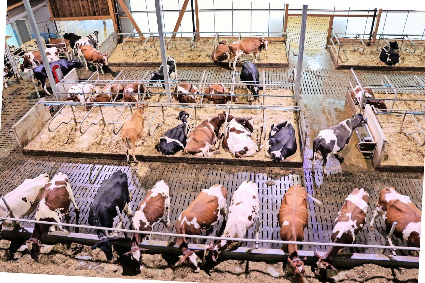 Es ist nicht von der Hand zu weisen, dass zwischen der Reduktion der Ammoniakemission und dem Tierwohl gewisse Synergien bestehen. Der erhöhte Fressbereich mit Fressplatzabtrennungen teilt den Laufgang in einen Lauf- und einen Fressbereich. Bei korrekter Dimensionierung des erhöhten Bereichs bleibt dieser grossmehrheitlich sauber, weil die Ausscheidungen in den Laufgang fallen. Dies verkleinert einerseits die emittierende Fläche, andererseits wirkt es sich positiv auf die Klauengesundheit aus, da die Kühe beim Fressen auf sauberem und trockenem Boden stehen. Zudem bieten die Fressstände einen sicheren Fressplatz, ohne dass sie durch Entmistungsschieber oder -roboter gestört werden.