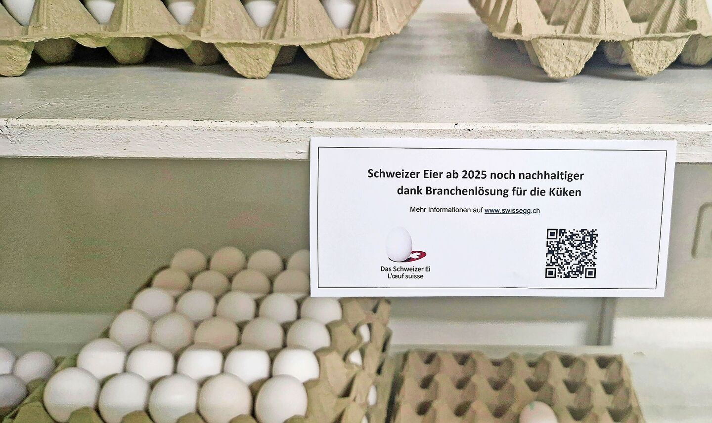 GalloSuisse, der Verband der Schweizer Eierproduzenten, hat ein zweiteiliges Informationsblatt herausgegeben mit dem Titel «Schweizer Eier ab 2025 noch nachhaltiger dank Branchenlösung für die Küken». Es kann individuell mit der effektiven Eierpreiserhöhung ergänzt und den Eierkunden abgegeben werden. Es begründet die Mehrkosten, erläutert den Ausstieg aus dem Kükentöten und zeigt den ganzen Eier-Produktionsprozess vom Brutei bis zum Konsumei und der geschlachteten Legehenne. Dieses Informationsblatt sowie ein Hinweis für das Verkaufsregal mit QR-Code (siehe Bild) können heruntergeladen werden auf der Webseite von GalloSuisse.